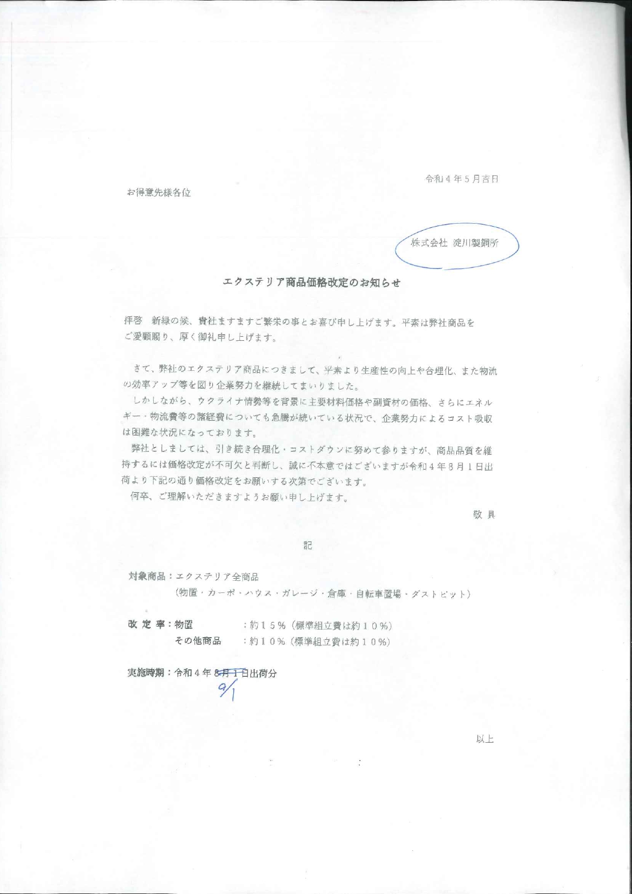 淀川製作所 エクステリア商品価格改定のご案内