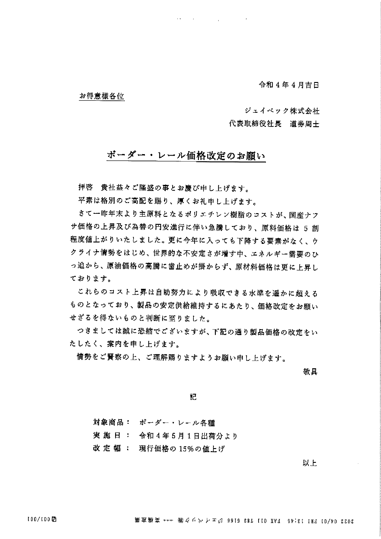 ジェイベック㈱ ボーダー・レール価格改定のお知らせ
